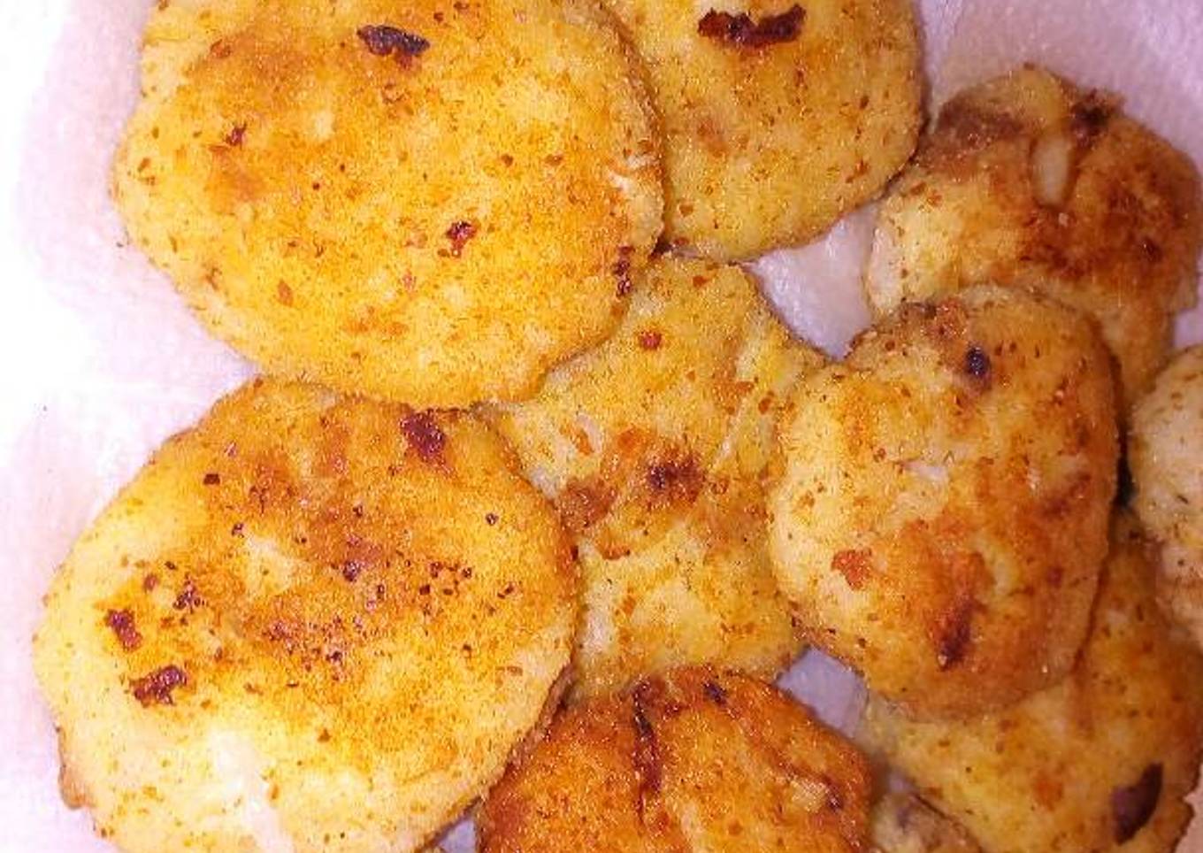 - Toma porciones de patata, dales forma de tortita, pasa por el pan molido y fríe, que tomen un color dorado.