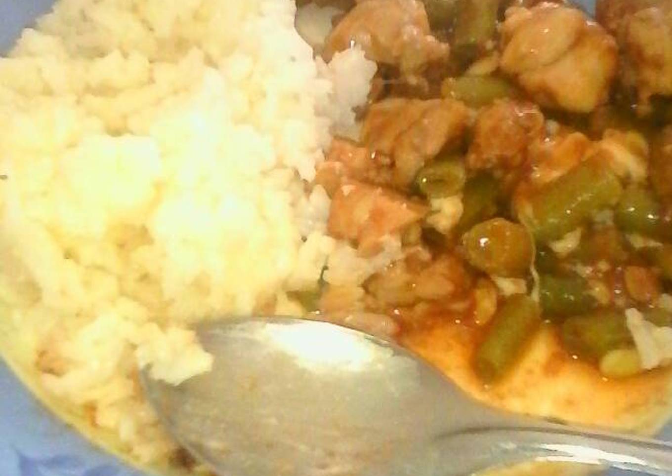 - Cuando este frito el pollo añadir los ejotes previamente estilados freírlos un poco y añadir la salsa y el puré de tomate y listo acompañar con un arroz a la mantequilla.
