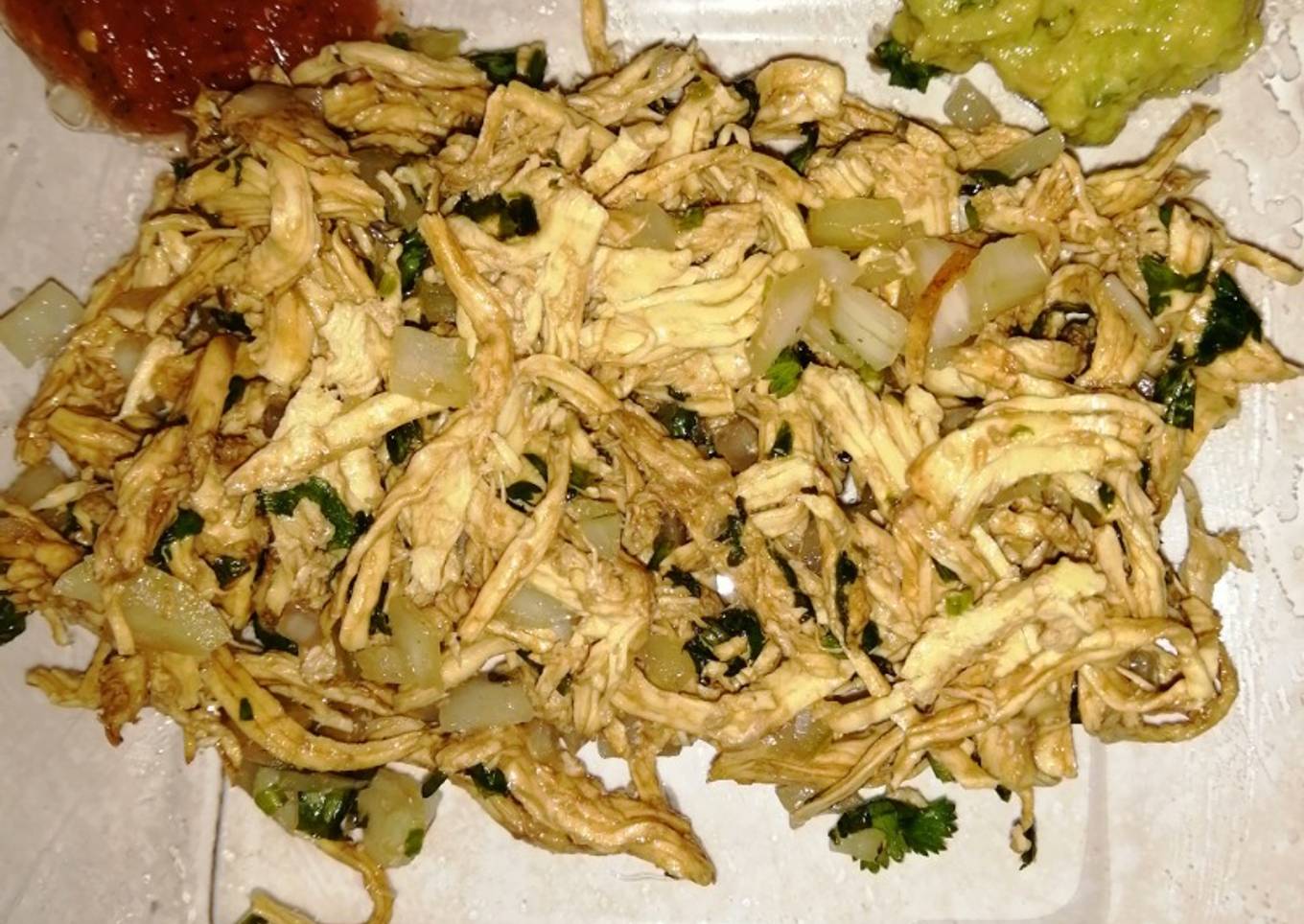 - Colocas toda la cebolla picada y el cilantro, al pollo desmenuzado