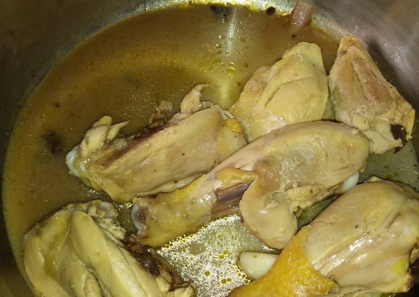 - Con el pollo limpio y sin piel, barniza cada pieza con muy poca mostaza (si usas mΓ‘s se amargarΓ‘ el pollo). En la olla de presiΓ³n que vayas a utilizar agrega la mantequilla y las piezas de pollo con la cebolla, el ajo y las especias. Ve volteando las piezas.
